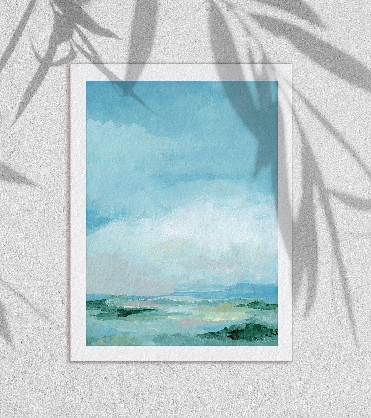 This coastal landscape doesn’t depict a specific place, it evokes one. The colors are intentionally dreamy, offering a sense of peace, calm, and ethereal beauty.